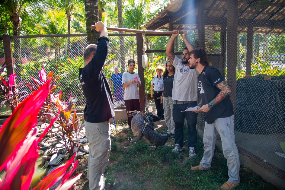 Após ser capturado o jacaré foi levado ao Centro Ecológico Projeto Caimam, submetido a avaliação clínica veterinária, medição, pesagem e sexagem, coleta de sangue, marcação, implantação de microchip debaixo da pele.