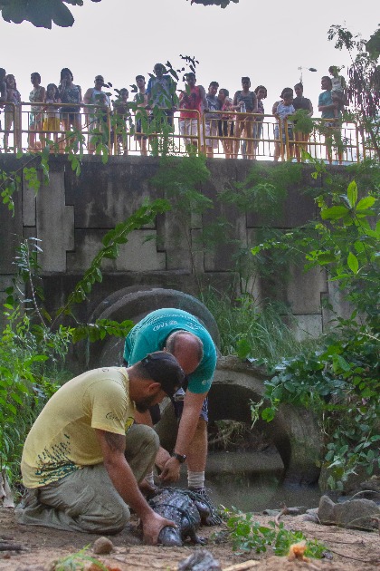O animal, que media aproximadamente 2 metros, se encontrava em um ponto de abordagem complexa, emaranhado em redes de pesca e raízes entre manilhas de água pluvial próximo a uma grande e importante avenida.