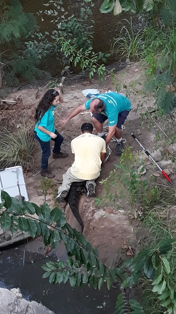 No dia 25 de maio, o Projeto Caiman foi acionado para mais um de resgate de Jacaré-de-Papo-Amarelo (Caiman latirostris). Desta vez o bicho estava na área do córrego Camburi, ao final da praia de mesmo nome.