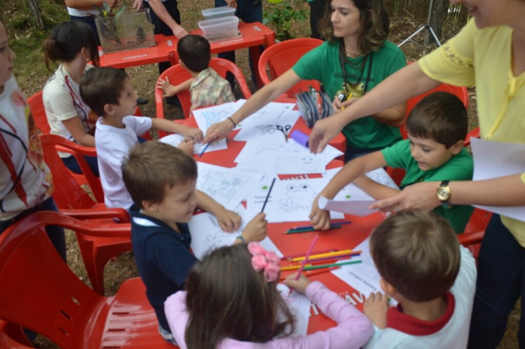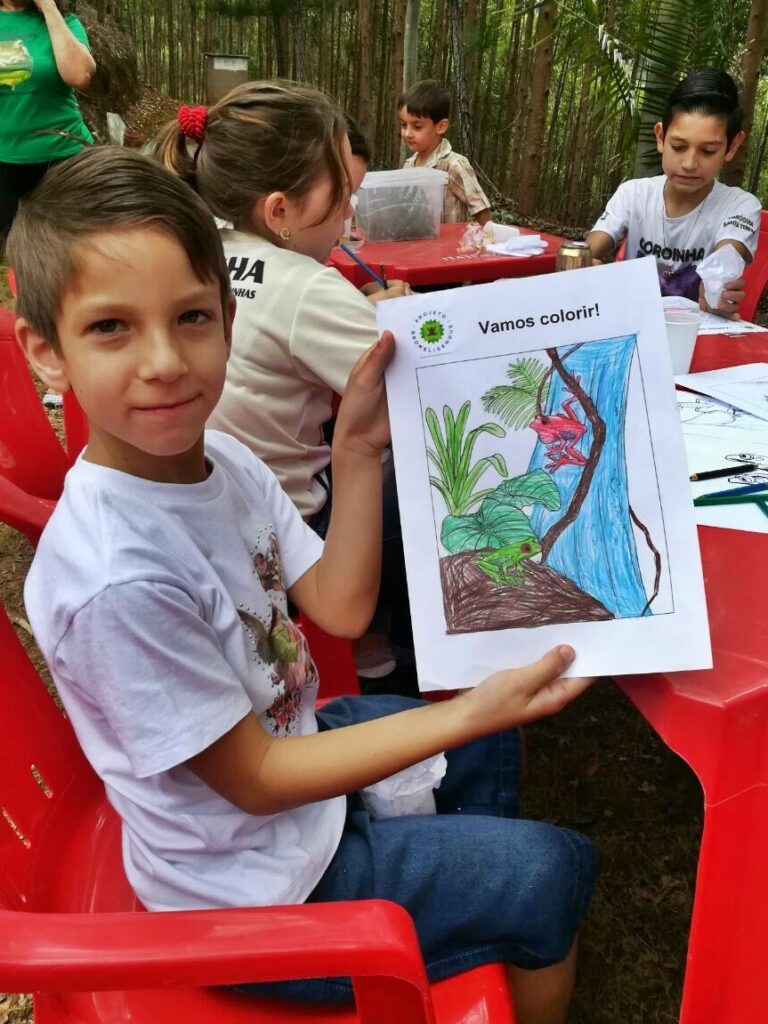 Nada mais satisfatório que ver o sorriso no rosto de uma criança colorindo um desenho. Se esse desenho for de um anfíbio então, melhor ainda! Pequenos detalhes como esse nos fazem acreditar num amanhã melhor para o planeta. Nos reunimos com os moradores da região de Nova Lombardia, área vizinha a Reserva Biológica Augusto Ruschi, em prol dos anfíbios e do meio ambiente, com jogos da memória e quebra-cabeças, desenhos para colorir, material informativo, banners e livros, mudas de árvores nativas da Mata Atlântica e muita conversa/troca de experiências.