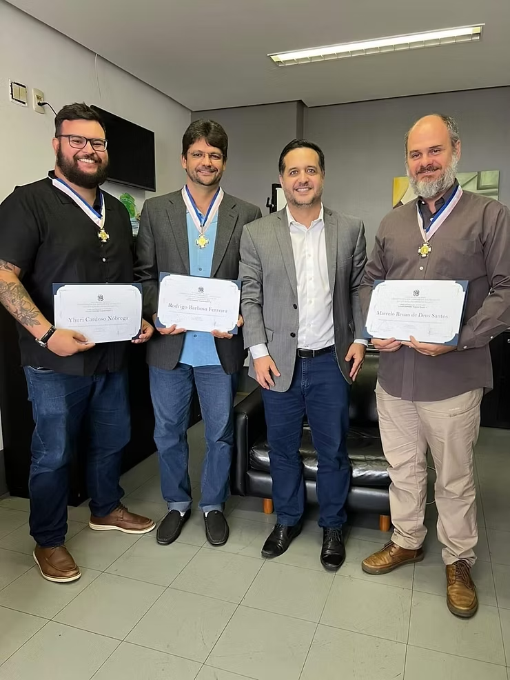 Os homenageados Yhuri Nóbrega, Rodrigo Ferreira e Marcelo Renan. Ao centro Dep. Estadual Fabricio Gandini