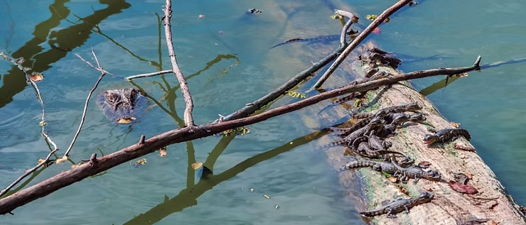 Depois de toda essa jornada até o nascimento, como estratégia de sobrevivência, instintivamente, é comum que os filhotes fiquem juntos, o que dá uma certa vantagem na fuga quando necessário. Além disso, também temos a mamãe jacaré como sentinela por um tempo, ficando perto para protegê-los de possíveis predadores. – Aqui você pode colocar a trilha sonora de vitória do Ayrton Senna para celebrar o nascimento de novos jacarezinhos.