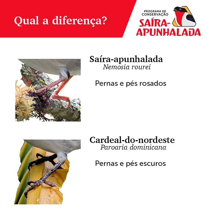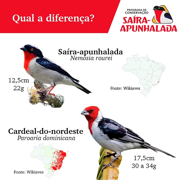 Muitas pessoas nos procuram contando que viram uma Saíra-apunhalada no quintal de casa, no sítio, na praça do bairro… Na maioria dos relatos o observador faz confusão com a espécie Cardeal-do-nordeste que é muito parecida com a Saíra.