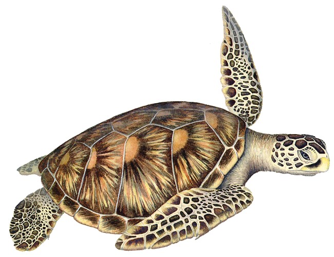 4- A tartaruga verde (Chelonia mydas) tem o casco verde-acinzentado e os filhotes possuem o dorso negro e o ventre branco. Seu nome vem da cor da sua gordura que é esverdeada. Quando juvenis se alimentam de algas e grama marinha, por isso são facilmente avistadas na costa brasileira. As fêmeas colocam seus ovos principalmente em ilhas oceânicas, como no arquipélago de Fernando de Noronha.
