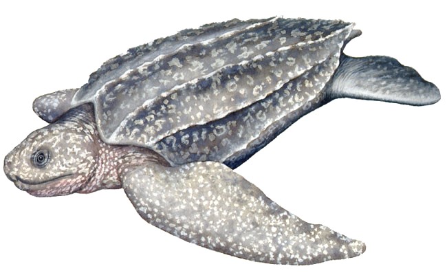 1- A tartaruga de couro (Dermochelys coriacea). Ela pode ser identificada pela sua coloração negra, com pintinhas brancas, azuladas e rosadas, sua mandíbula em forma de W e a ausência de unhas. Sua carapaça possui 7 quilhas longitudinais e é coberta por uma fina camada de pele que lembra o aspecto de couro, por isso o seu nome! Ela é a maior espécie de tartaruga marinha, podendo medir até dois metros de comprimento de casco e pesar até 750 quilos. A tartaruga de couro vive sempre em alto-mar, por isso é tão difícil de avistá-la. Porém, durante os meses de outubro a dezembro, as fêmeas podem ser encontradas no litoral do Espírito Santo, colocando seus ovos.