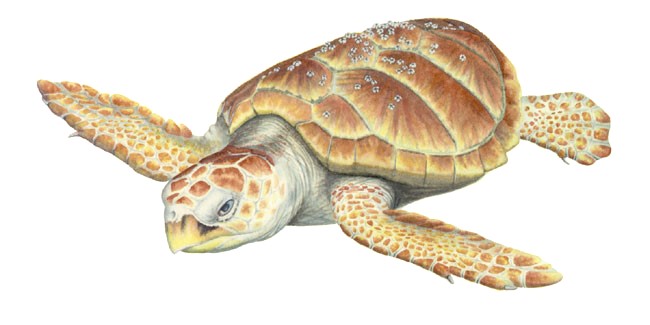 6- A tartaruga de kemp (Lepidochelys kempii) é uma das menores espécies de tartarugas marinhas, os adultos medem até 75 cm de comprimento e pesam entre 35 e 45 kg. Sua carapaça possui formato oval com 5 pares de placas laterais e coloração verde oliva, porém quando juvenis são pretas. Está criticamente ameaçada de extinção e sua distribuição geográfica se restringe ao Golfo do México e Atlântico Norte. Seu nome se origina do pesquisador Richard Morre Kemp, que enviou o primeiro espécimen para ser estudado em Harvard.