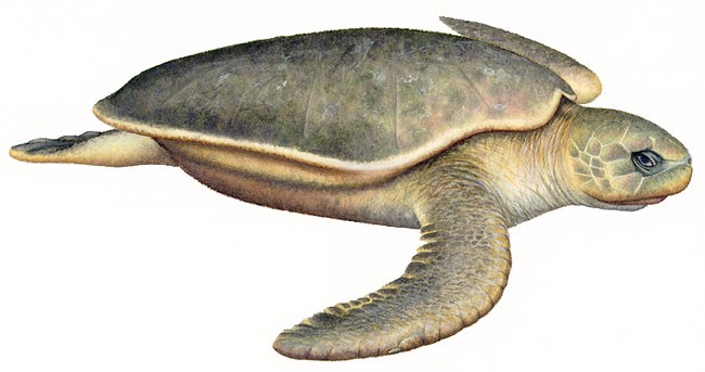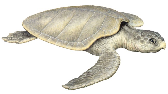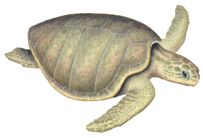 2- A tartaruga oliva (Lepidochelys olivacea) é a que apresenta o maior número, de 6 a 9 pares. É a menor das espécies brasileiras, podendo pesar até 50 kg. Seu nome se dá pela coloração verde oliva da carapaça. Se você quiser encontrar essa espécie adulta, viaje para a costa do Sergipe, que é o estado com mais desovas. Mas que quiser ver juvenis vá para o Ceará.