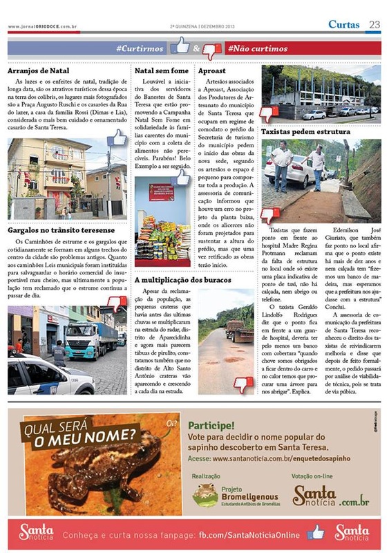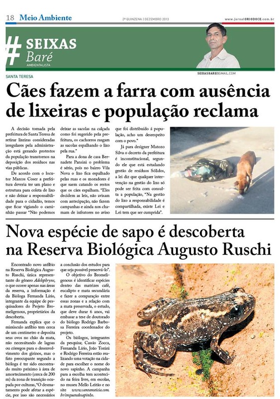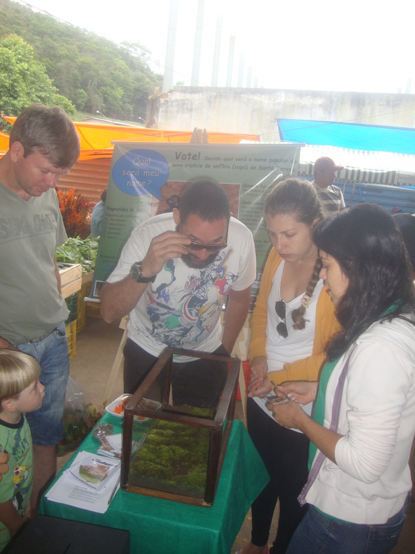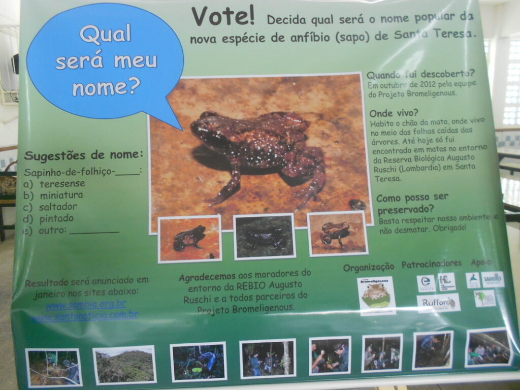De forma inédita no Brasil, em dezembro de 2014 a região de Santa Teresa participou com mais de mil votos para escolher o nome popular de uma nova espécie de anfíbio encontrado pelo Projeto Bromeligenous. Dentre as opções o nome escolhido foi rãzinha-pulga-teresensis. Cientificamente a espécie foi denominada Adelophryne glandulata. Os alunos da Escola Ethevaldo Damazio puderam ver a nova espécie e também votar. Essa atividade também foi realizada na Feira Livre de Santa Teresa e no Museu de Biologia Mello Leitão. O olhar de curiosidade das crianças em ver com os próprios olhos uma espécie nova para o município revelou a importância de atividades de popularização da ciência. Contando com o abraço da população local, a matéria dessa atividade foi divulgada por variadas mídias regionais e nacionais (GazetaOnline, G1, Globo Rural, Santa Notícia etc).